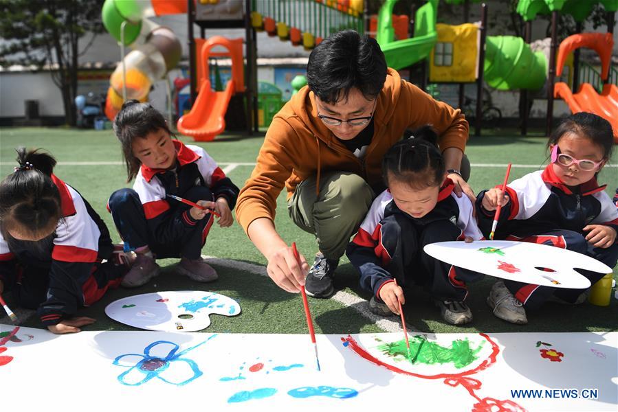 Yang Yanbo, a staff member of China Construction Third Engineering Bureau Co., Ltd., and kids from Hejiazhuang primary school paint in Hejiazhuang Village of Wangba Township in Kangxian County, northwest China's Gansu Province, May 30, 2020. Staff of China Construction Third Engineering Bureau Co., Ltd. came to Hejiazhuang Village, their long-term poverty alleviation target village, carrying out fun activities with the children of Hejiazhuang primary school and Hejiazhuang kindergarten, to celebrate the upcoming International Children's Day. (Xinhua/Chen Bin)