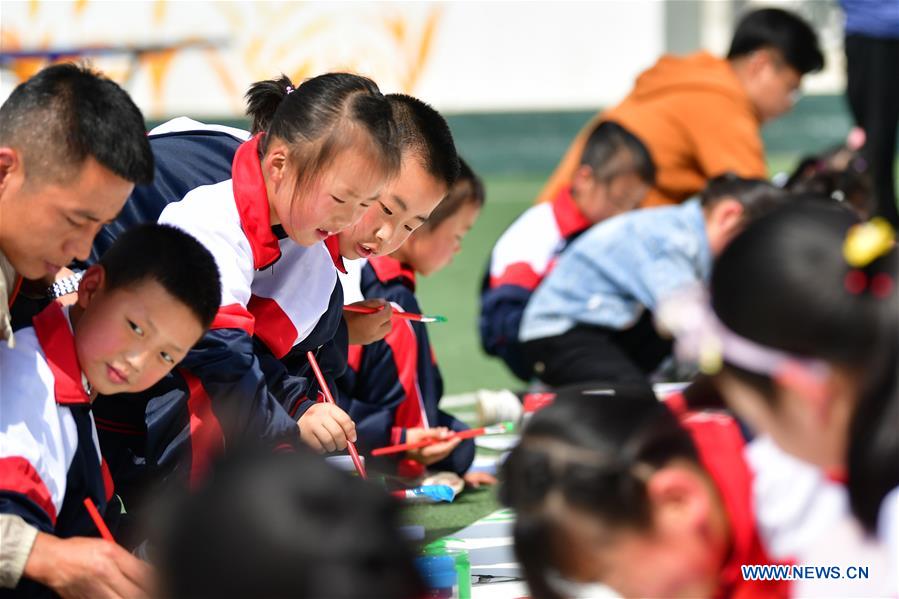 Children from Hejiazhuang primary school paint in Hejiazhuang Village of Wangba Township in Kangxian County, northwest China's Gansu Province, May 30, 2020. Staff of China Construction Third Engineering Bureau Co., Ltd. came to Hejiazhuang Village, their long-term poverty alleviation target village, carrying out fun activities with the children of Hejiazhuang primary school and Hejiazhuang kindergarten, to celebrate the upcoming International Children's Day. (Xinhua/Chen Bin)