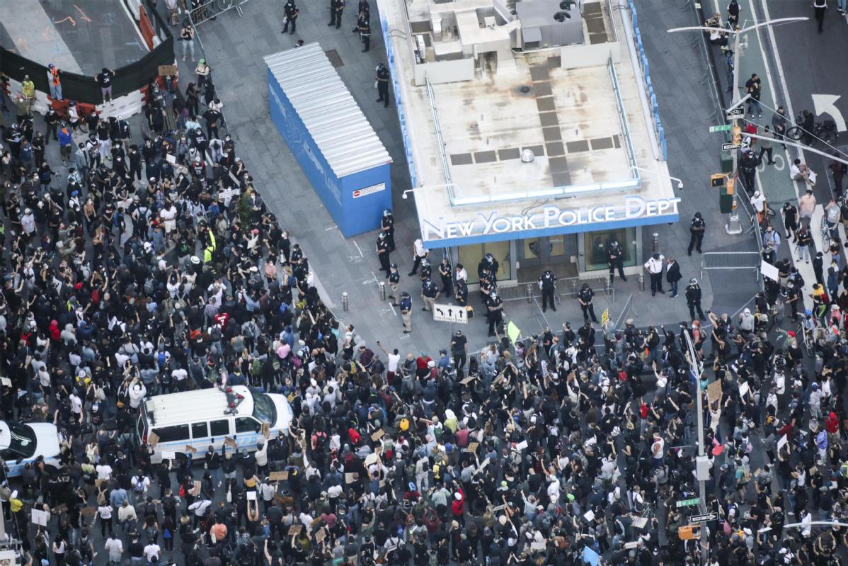 Protesters gather outside the New York Police Department at Times Square in New York City on Sunday. It was the sixth day of protests and violent unrest, sparked by the death of George Floyd, a black man who died in Minneapolis police custody. (Xinhua Photo)