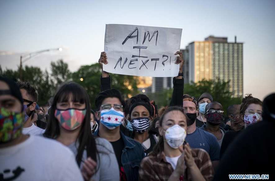 Demonstrators take part in a protest in Uptown neighborhood of Chicago, the United States, June 1, 2020. Two people were shot dead and at least 60 were arrested as protests and looting continued in Chicago neighborhoods and suburbs on Monday in response to the police killing of George Floyd. (Photo by Chris Dilts/Xinhua)