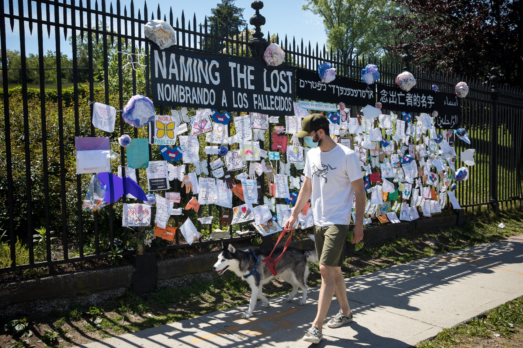 A man wearing a face mask walks by a memorial for COVID-19 victims in front of Green-Wood Cemetery in Brooklyn borough of New York, the United States, May 27, 2020. (Photo by Michael Nagle/Xinhua)