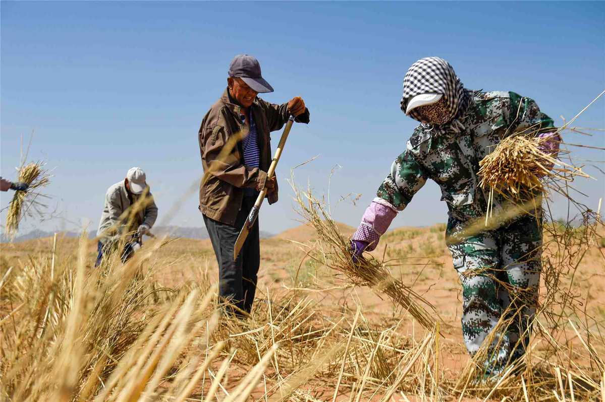 Workers sow grass seeds to prevent desertification in Zhongwei, Ningxia Hui autonomous region, in 2019. [Photo/Xinhua]