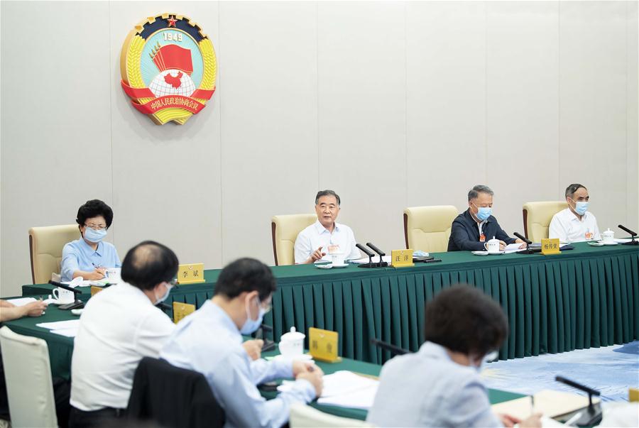 Wang Yang, a member of the Standing Committee of the Political Bureau of the Communist Party of China Central Committee and chairman of the Chinese People's Political Consultative Conference (CPPCC) National Committee, attends the panel discussions in Beijing, capital of China, June 23, 2020. Chinese political advisors held panel discussions on Tuesday to discuss winning the battle against poverty and establishing a long-term mechanism to address relative poverty. The discussions took place at an ongoing meeting of the Standing Committee of the 13th National Committee of the CPPCC. (Xinhua/Li Tao)