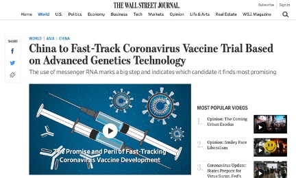 China’s Academy of Military Medical Sciences has received approval to conduct human scientific trials of a novel coronavirus messenger RNA (mRNA) vaccine candidate developed using advanced genetics technology, signaling “a notable breakthrough for China’s quickly developing pharmaceutical industry,” wrote The Wall Street Journal on June 27.