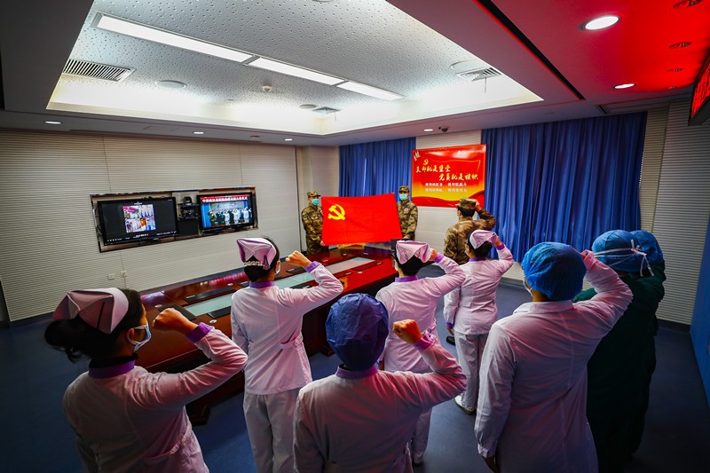 Members of the Communist Party of China (CPC) renew membership oath during an online ceremony held in the Wuchang, Hankou branches of the General Hospital of the People’s Liberation Army Central Theater Command, the Wuhan Pulmonary Hospital and Wuhan No.7 Hospital, Feb. 17. Seven applicants joined the CPC at the ceremony. Photo by Wang Haoyu/People’s Daily Online