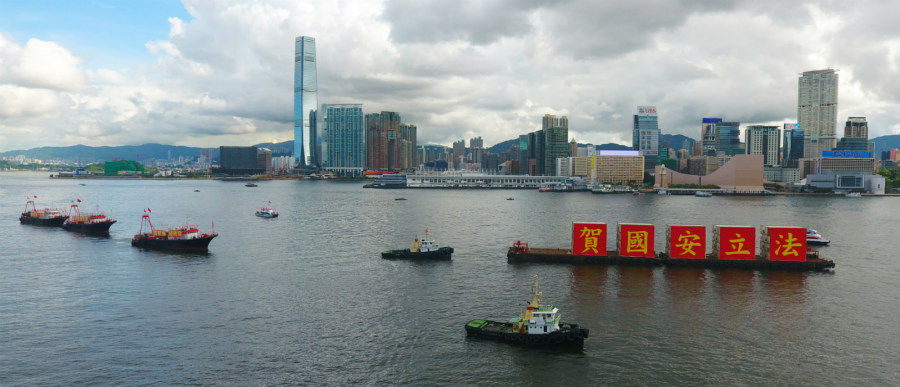 A ship carrying the slogan of "celebrating the passage of the Law of the People's Republic of China on Safeguarding National Security in the Hong Kong Special Administrative Region (HKSAR)" sails at the Victoria Harbour in Hong Kong, China, July 1, 2020. (Xinhua/Lui Siu Wai)