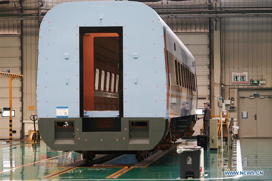 A technician works on a high-speed trains production line of CRRC Tangshan Co., Ltd. in Tangshan City in north China's Hebei Province, July 16, 2020. The production capacity of this company has recovered from the effect of COVID-19 with the help of local governments to fulfil the orders from home and abroad. (Xinhua/Xing Guangli)