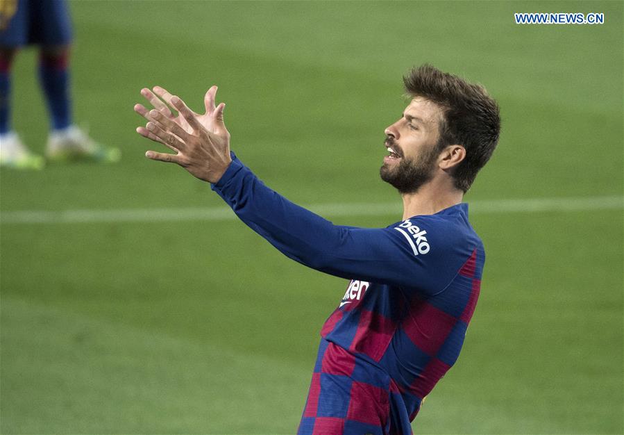 Barcelona's Gerard Pique reacts after missing a goal during the 2019-2020 Spanish La Liga football match between Barcelona and Osasuna in Barcelona, Spain, July 16, 2020. (Photo by Joan Gosa/Xinhua)