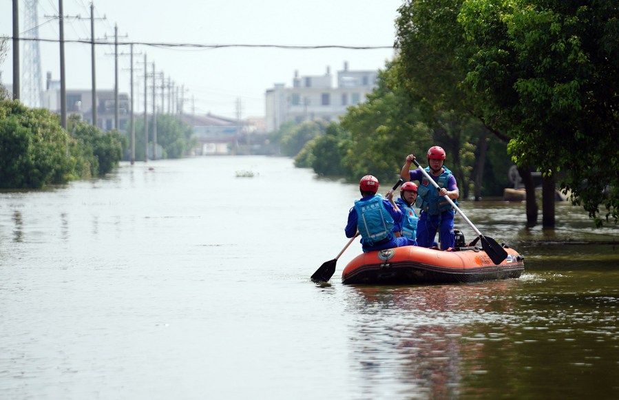 Rescuers are on the way to transfer trapped people in Sanjiao Township in Yongxiu County, east China's Jiangxi Province, July 13, 2020. (Xinhua/Zhou Mi)