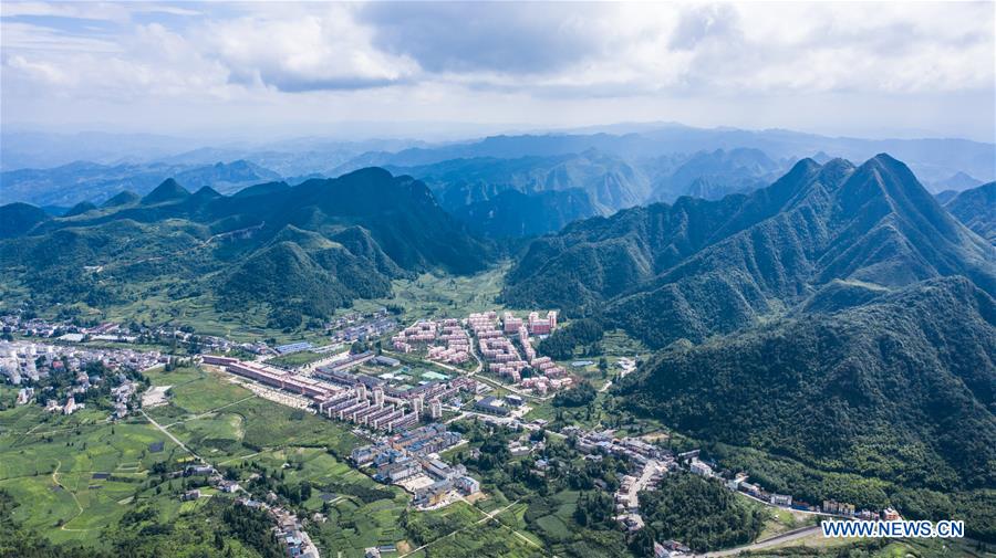 Aerial photo shows a view of Shanbao community in Jiuba Township, Tongzi County, southwest China's Guizhou Province, July 21, 2020. Rural development in Tongzi County has gained new momentum in recent years as efforts are put into local tourism which features beautiful countryside hostels. So far, more than 500 locally registered poverty-stricken rural residents have been directly employed in the tourism industry. Meanwhile, some 6,000 others have seen their income rise while working in tourism-related businesses. (Xinhua/Tao Liang)