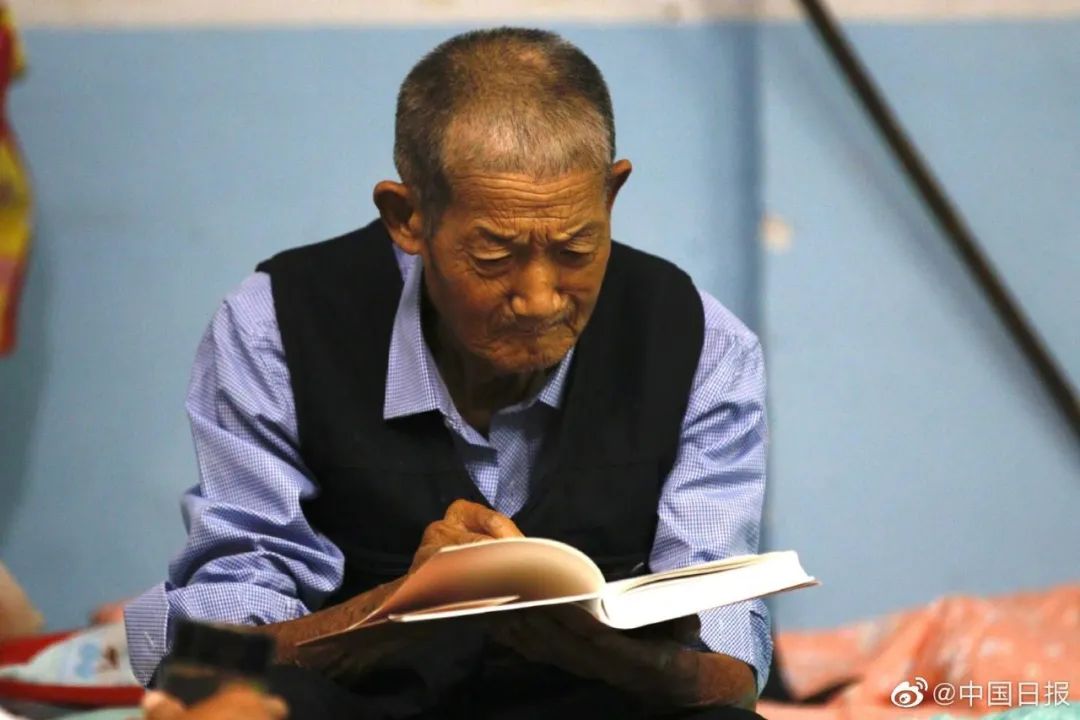 Photos of an 81-year-old man, Hu Minghu, insisting on reading books even after being transferred to a relocation site due to the flood has touched the heart of many Chinese netizens.