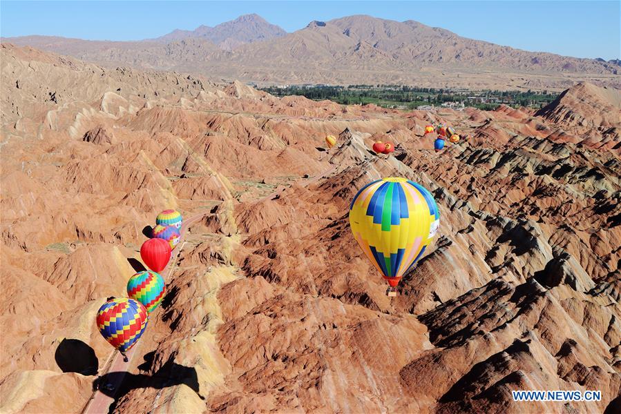 Hot air balloons rise up at Danxia National Geological Park in Zhangye, northwest China's Gansu Province, July 26, 2020. An international hot air balloons festival opened here on Sunday. A total of 100 hot air balloons will bring performances during the festival. (Photo by Cheng Lin/Xinhua)