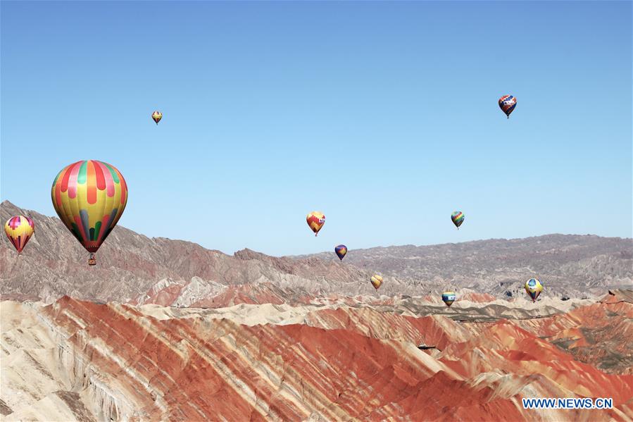 Hot air balloons are seen in the sky at Danxia National Geological Park in Zhangye, northwest China's Gansu Province, July 26, 2020. An international hot air balloons festival opened here on Sunday. A total of 100 hot air balloons will bring performances during the festival. (Photo by Cheng Lin/Xinhua)