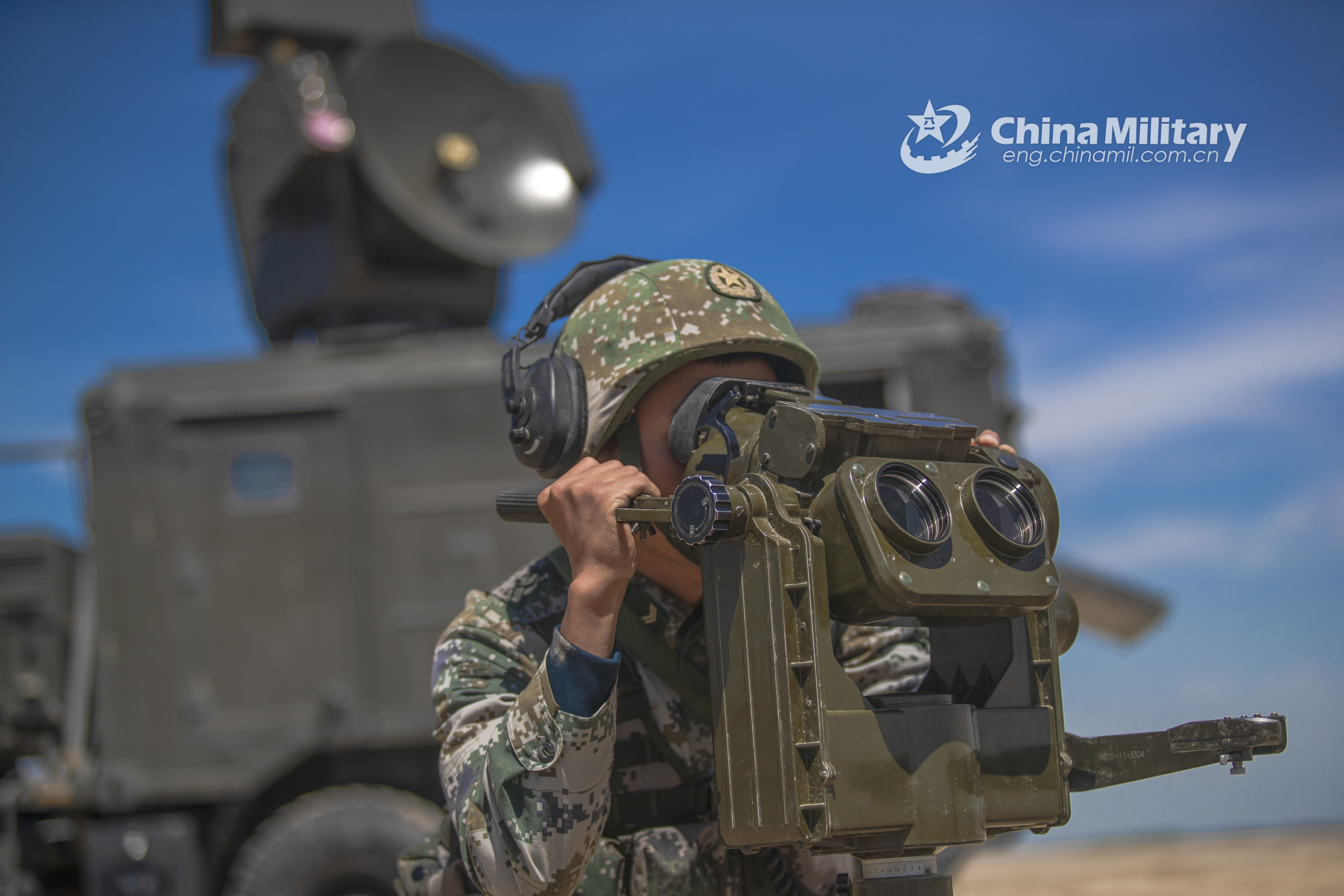A soldier assigned to a regiment under the PLA Xinjiang Military Command uses a sighting device to lock target during a field live-fire test in northwest desert area after a long-distance maneuver in late July, 2020. (eng.chinamil.com.cn/Photo by Chen Ming, Tai Hao, Liu Xiaoyun and Huang Feihao)