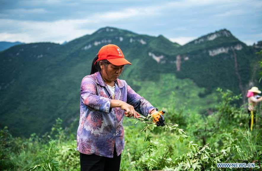 A villager harvests Sichuan pepper in Tongzi County, southwest China's Guizhou Province, July 22, 2020. The Sichuan pepper industry in Tongzi County has become an important industry that helps the local people to shake off poverty. (Xinhua/Tao Liang)