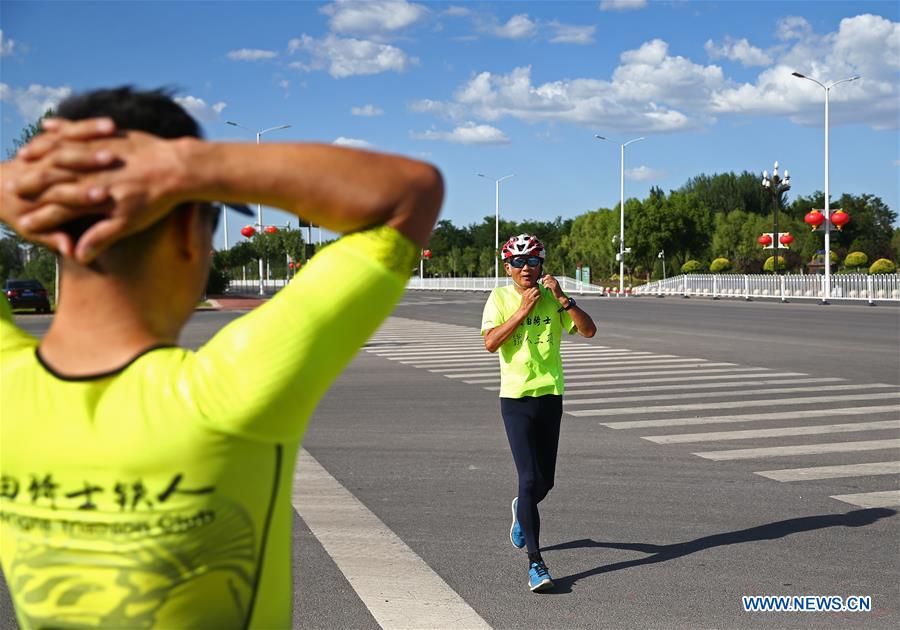 Photo taken on July 26, 2020 shows Gu Dawo (1st L), an endurance sports enthusiast, stretching together with his triathlon club teammates after attending a cycling training in Yinchuan, northwest China's Ningxia Hui Autonomous Region. Gu Dawo, a 75-year-old Chinese grandpa, finished this year's Xiamen International Marathon with a remarkable time of 4 hours, 23 minutes and 45 seconds, which astonished many younger runners. Having embarked on training for marathon at the age of 69, Gu finished his first half marathon in 2013. Since then, Gu has begun running numberous marathon events across China. In 2017, Gu showed up as the oldest-ever offical pacer in Yinchuan Internaional Marathon. After swimming and cycling became parts of his daily fitness, Gu made attempts to train for triathlon, a multisport with three continuous and sequential endurance races. In 2017, he went to Chattanooga of Tennessee of the United States to compete in the Ironman 70.3. As the oldest one to complete the triathlon in the event, Gu was introduced to be from China in the award ceremony. Gu Dawo wants to encourage the young to exercise more, and also correct their bias against the aged. "The age will not stop my heart and feet from running ahead." Gu said. (Xinhua/Feng Kaihua)