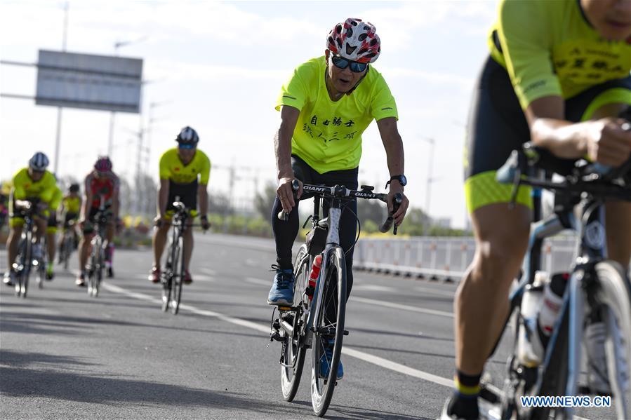 Photo taken on July 26, 2020 shows Gu Dawo (1st L), an endurance sports enthusiast, stretching together with his triathlon club teammates after attending a cycling training in Yinchuan, northwest China's Ningxia Hui Autonomous Region. Gu Dawo, a 75-year-old Chinese grandpa, finished this year's Xiamen International Marathon with a remarkable time of 4 hours, 23 minutes and 45 seconds, which astonished many younger runners. Having embarked on training for marathon at the age of 69, Gu finished his first half marathon in 2013. Since then, Gu has begun running numberous marathon events across China. In 2017, Gu showed up as the oldest-ever offical pacer in Yinchuan Internaional Marathon. After swimming and cycling became parts of his daily fitness, Gu made attempts to train for triathlon, a multisport with three continuous and sequential endurance races. In 2017, he went to Chattanooga of Tennessee of the United States to compete in the Ironman 70.3. As the oldest one to complete the triathlon in the event, Gu was introduced to be from China in the award ceremony. Gu Dawo wants to encourage the young to exercise more, and also correct their bias against the aged. "The age will not stop my heart and feet from running ahead." Gu said. (Xinhua/Feng Kaihua)