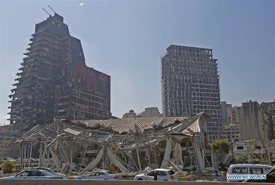 Damaged buildings are seen after the explosions near the Port of Beirut in Lebanon, Aug. 5, 2020. The explosions in Lebanese capital Beirut have caused at least 100 deaths and left over 4,000 injured, with many more missing, Lebanese Health Minister Hamad Hassan announced on Wednesday. (Xinhua/Bilal Jawich)