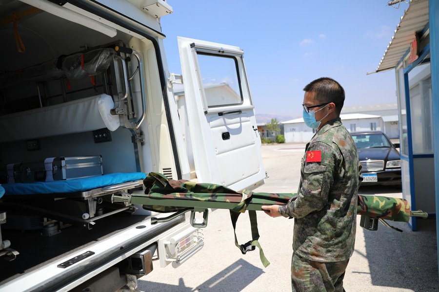 A Chinese peacekeeper prepares stretchers at the camp of the Chinese peacekeeping forces to Lebanon, on Aug. 5, 2020. (Xinhua)