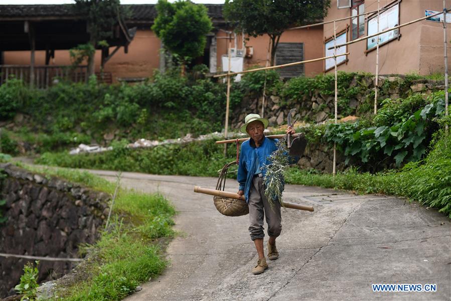 A villager walks in the street in Yangjiatang Village of Songyang County, Lishui City, east China's Zhejiang Province, July 17, 2020. In recent years, Songyang County has invested nearly 300 million yuan (about 43 million U.S. dollars) in renovating and protecting local traditional villages. Meanwhile, the county has taken advantages of the traditional rural characters to develop local tourism. By the end of 2019, a total of 526 homestays have been developed and the yearly tourism revenue of the county reached 170 million yuan (about 24 million U.S. dollars) in 2019. (Xinhua/Huang Zongzhi)