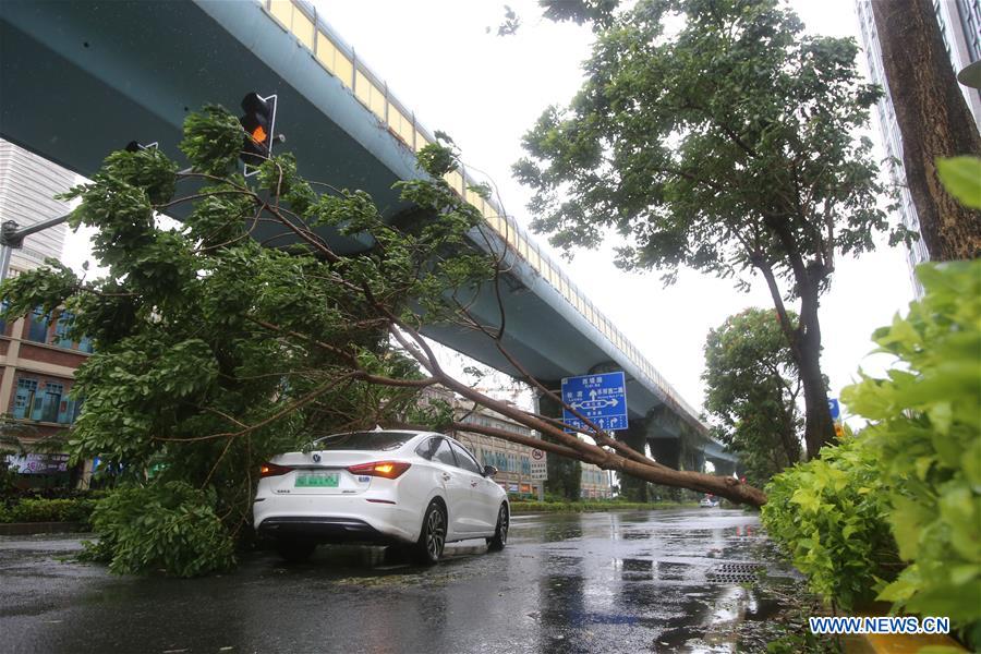 A car is covered under a fallen tree in Xiamen, southeast China's Fujian Province, Aug. 11, 2020. Typhoon Mekkhala, the sixth this year, made landfall at around 7:30 a.m. Tuesday in Zhangpu County, east China's Fujian Province, bringing gales of up to 33 meters per second near its eye, according to local meteorological authorities. (Photo by Zeng Demeng/Xinhua)