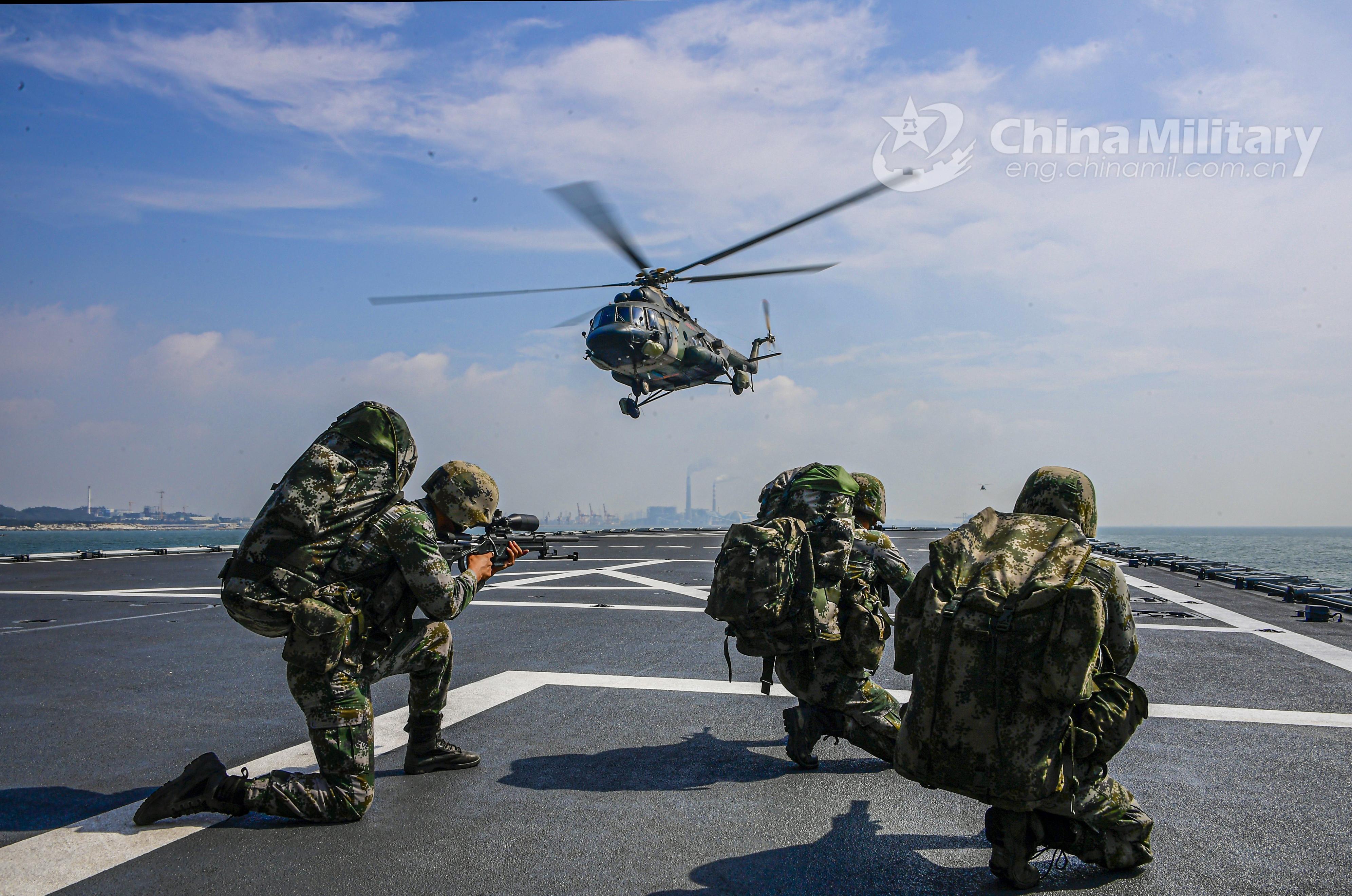 PLA Army soldiers look through the sights of their rifles as they provide security for the hovering transport helicopter during an inter-Services maritime coordinated training exercise with the PLA Navy at an undisclosed sea area on August 3, 2020. They are assigned to an army aviation brigade under the PLA 73rd Group Army. (eng.chinamil.com.cn/Photo by Li Shilong)
