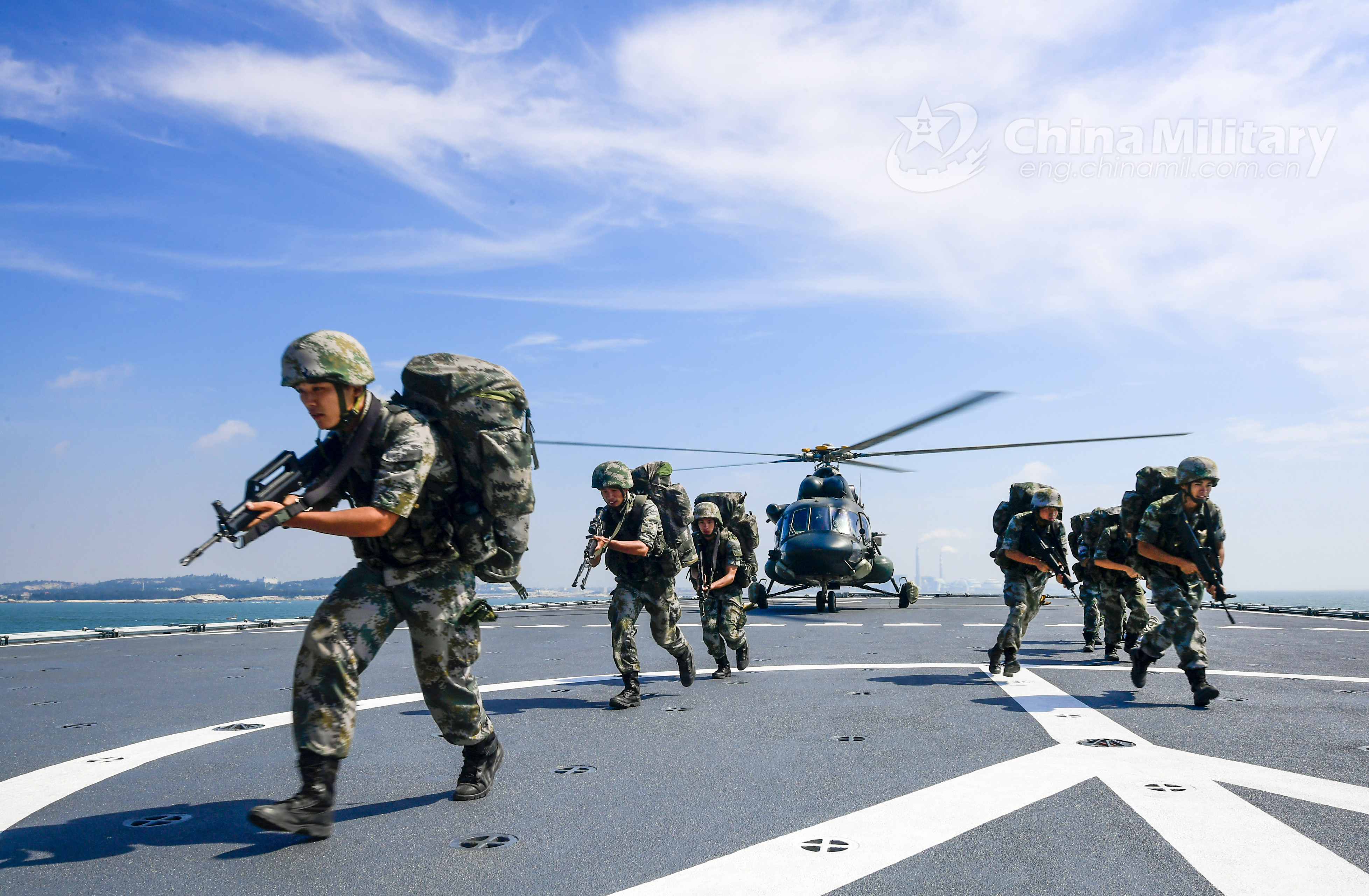 PLA Army soldiers rush to form into a combat readiness formation on the flight deck of the dock landing ship Yimengshan (Hull 988) after stepping off a transport helicopter during an inter-Services maritime coordinated training exercise with the PLA Navy at an undisclosed sea area on August 3, 2020. They are assigned to an army aviation brigade under the PLA 73rd Group Army. (eng.chinamil.com.cn/Photo by Li Shilong)