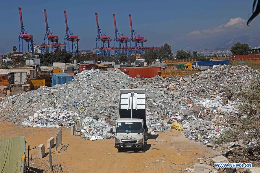 The shattered glasses are collected to be recycled at a dump in Beirut, Lebanon, Aug. 16, 2020. Two huge explosions rocked Port of Beirut on Aug. 4, shaking buildings all over the Lebanese capital, and killing over 177 while wounding 6,000 others. Losses were estimated by Beirut's governor at more than 10 billion U.S. dollars. (Xinhua/Bilal Jawich)
