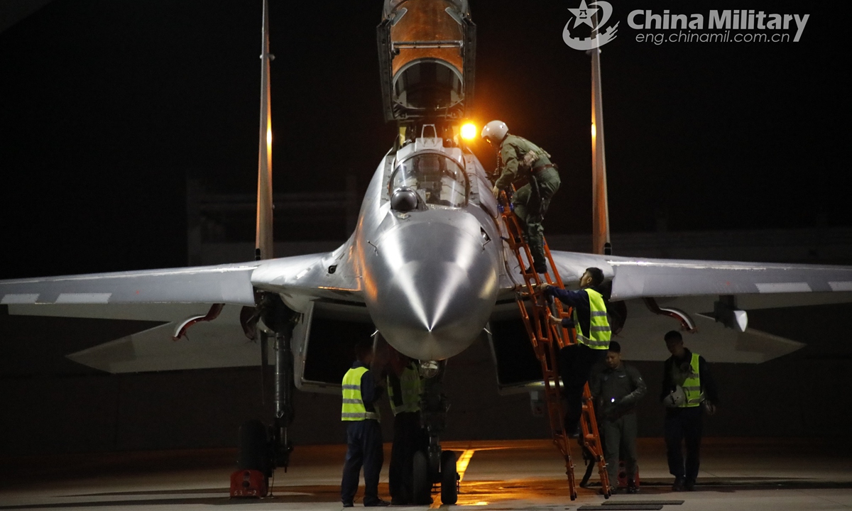 A pilot assigned to an aviation regiment under the PLA Air Force climbs into the cockpit of his fighter jet prior to a night flight training exercise in late June, 2020. (eng.chinamil.com.cn/Photo by Tang Huaihui)