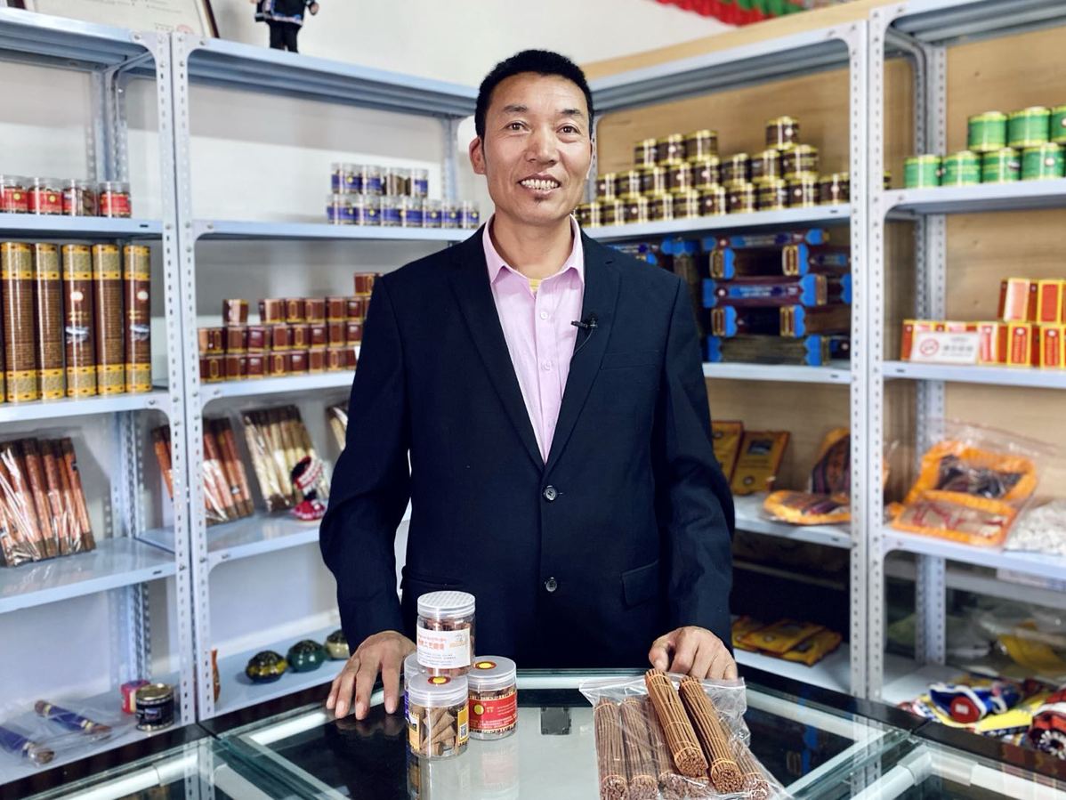 Samdrup presents his Tibetan incense products in Gyalmed village, Puchu township of Nyingchi city, Southwest China's Tibet autonomous region, Aug 17, 2020. [Photo by Wang Yuxi/chinadaily.com.cn]