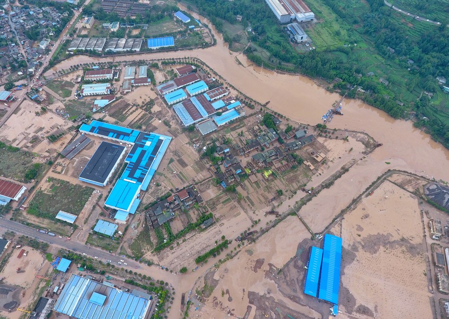 Aerial photo taken on Aug.18, 2020 shows a view of the flood-hit Caoba Township, Ya'an City, southwest China's Sichuan Province. (Xinhua/Liu Kun)