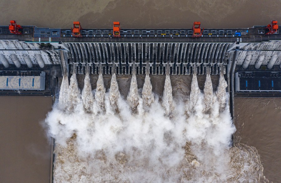 Aerial photo taken on Aug. 20, 2020 shows floodwater gushing out from the Three Gorges Dam in central China's Hubei Province. (Photo by Xiang Hongmei/Xinhua)