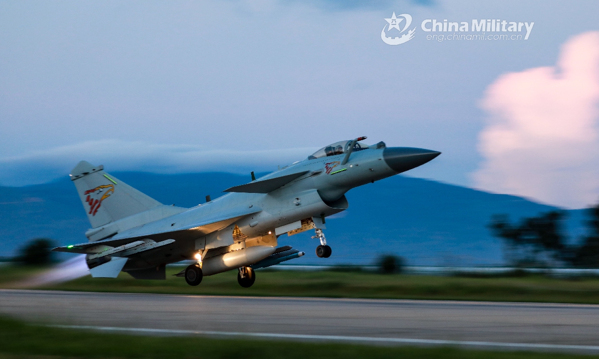 A J-10 fighter jet attached to an aviation brigade of the air force under the PLA Southern Theater Command takes off for a flight mission in early August, 2020. (eng.chinamil.com.cn/Photo by Wang Guoyun)