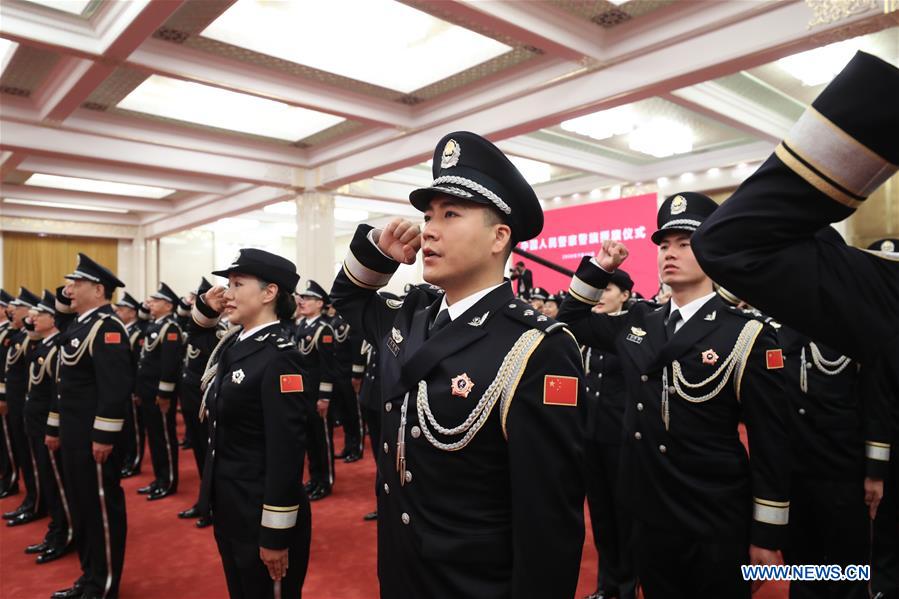 Police officers take an oath during a ceremony to confer the police flag on China's police force at the Great Hall of the People in Beijing, capital of China, Aug. 26, 2020. (Xinhua/Ju Peng)