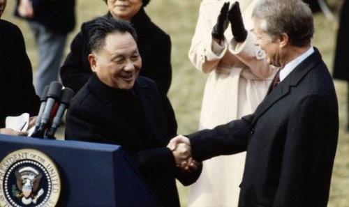 Former Vice Premier of China Deng Xiaoping shakes hands with then U.S. President Jimmy Carter at the White House, Jan. 30, 1979. File photo