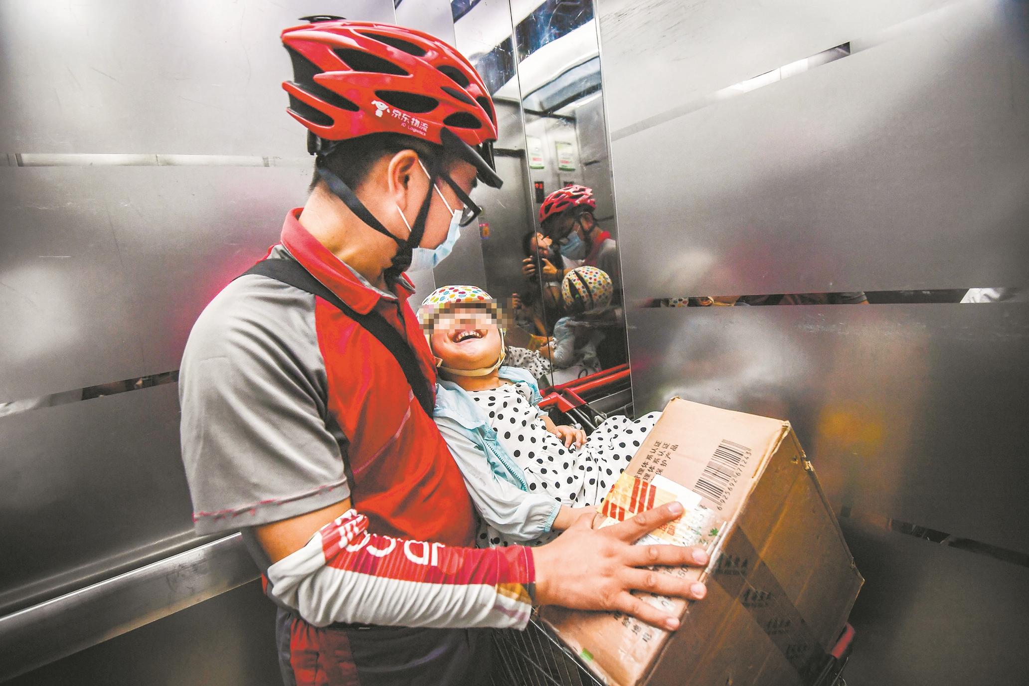 Yang Bi, a deliveryman from Wuhan, central China's Hubei province, has been working in a logistics company for five years. His second baby was born just a few weeks ago, and since then he has taken Tongdong, his elder daughter with cerebral palsy, on his rounds.