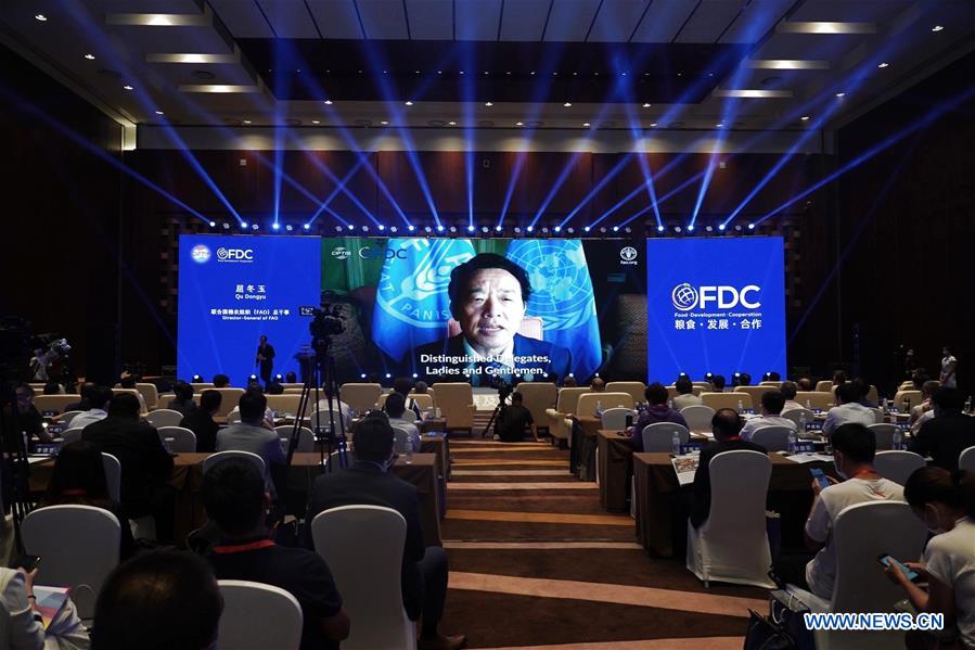 Qu Dongyu, director-general of the UN Food and Agriculture Organization (FAO), addresses the International Forum for Development and Investment of Modern Supply Chain of Food via video during the 2020 China International Fair for Trade in Services (CIFTIS) in Beijing, capital of China, Sept. 7, 2020. (Xinhua/Cai Yang)