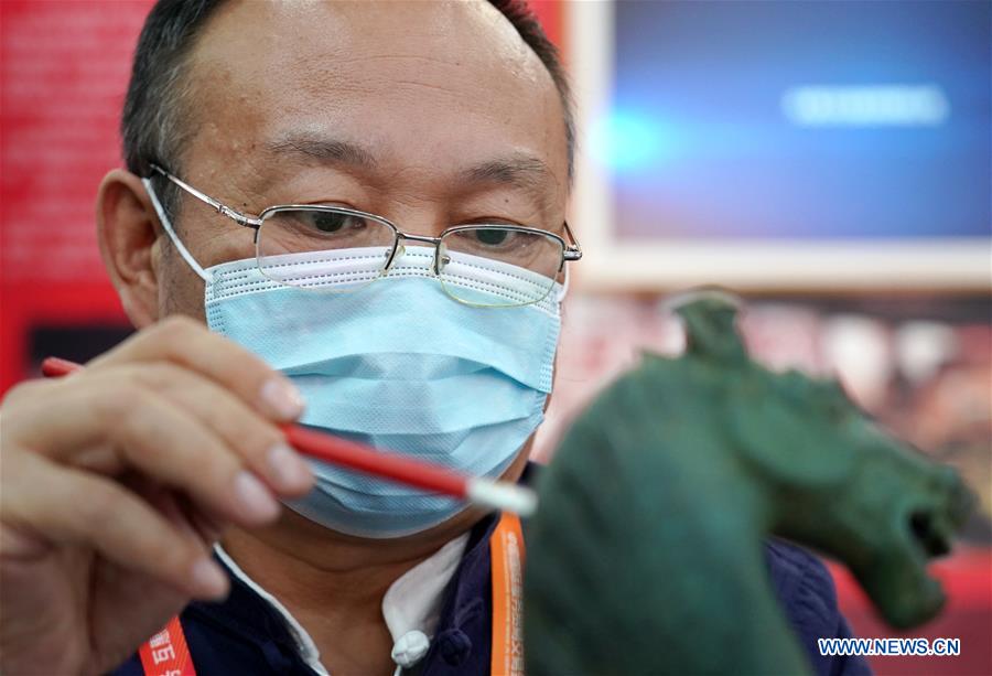Cultural relics restoration expert Han Song demonstrates restoration technique of bronze ware at the cultural services exhibition area of the 2020 China International Fair for Trade in Services (CIFTIS) in Beijing, capital of China, Sept. 8, 2020. (Xinhua/Zhang Chenlin)