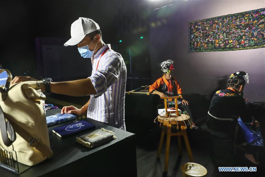 Visitors select products of "Mom Handworks" at the exhibition area of the 2020 China International Fair for Trade in Services (CIFTIS) in Beijing, capital of China, Sept. 7, 2020. Four artisans of "Mom Handworks" from southwest China's Guizhou Province demonstrated embroidery works of the Miao ethnic group at the fair. "Mom Handworks" is a public welfare project initiated in 2016. Since then, a total of 49 "Mom Handworks Cooperatives" have been established in 14 provinces nationwide. The project helps create jobs for poverty-stricken mothers and provide them with skills to make handicrafts with local ethnic flavors. It also serves as a platform to promote China's intangible cultural heritages and carry forward traditional Chinese culture. (Xinhua/Zhang Yuwei)
