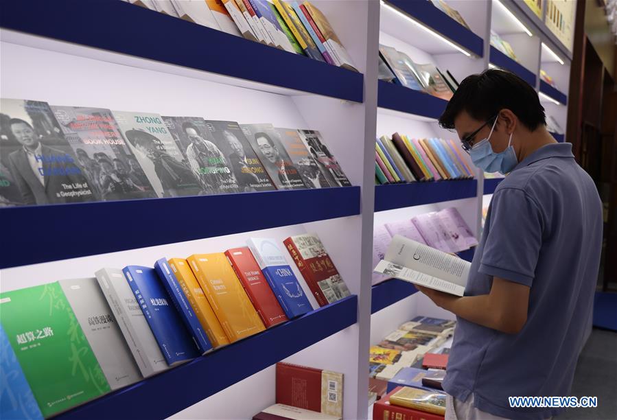 A visitor reads a book at the cultural services exhibition area of the 2020 China International Fair for Trade in Services (CIFTIS) in Beijing, capital of China, Sept. 8, 2020. (Xinhua/Xing Guangli)