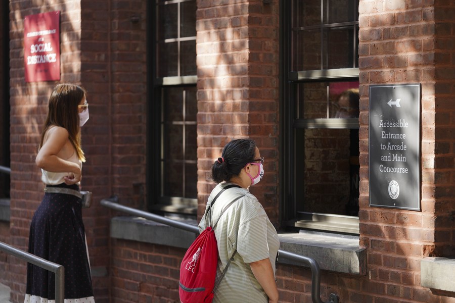 People wait for food at the outdoor catering zone of the Chelsea Market in New York, the United States, Sept. 7, 2020. (Xinhua/Wang Ying)