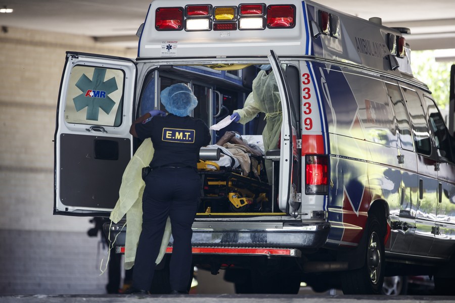 Medical workers transport a patient from an ambulance to George Washington University Hospital in Washington D.C., the United States, May 13, 2020. (Photo by Ting Shen/Xinhua)