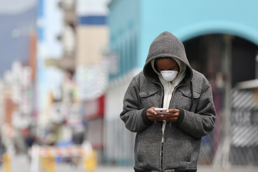 A man wearing a mask is seen on a street near Venice Beach, Los Angeles, the United States, April 10, 2020. (Xinhua)