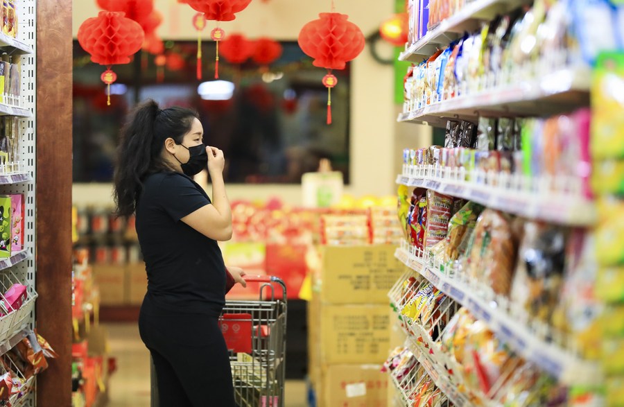 A customer wearing a face mask shops in a supermarket in Los Angeles, California, the United States, March 4, 2020. (Xinhua/Li Ying)