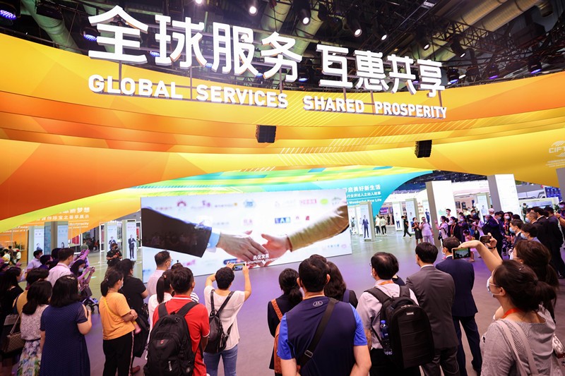 Visitors watch a video in the comprehensive exhibition area of the 2020 China International Fair for Trade in Services (CIFTIS) on September 6. (Photo by Chen Xiaogen/People's Daily Online)