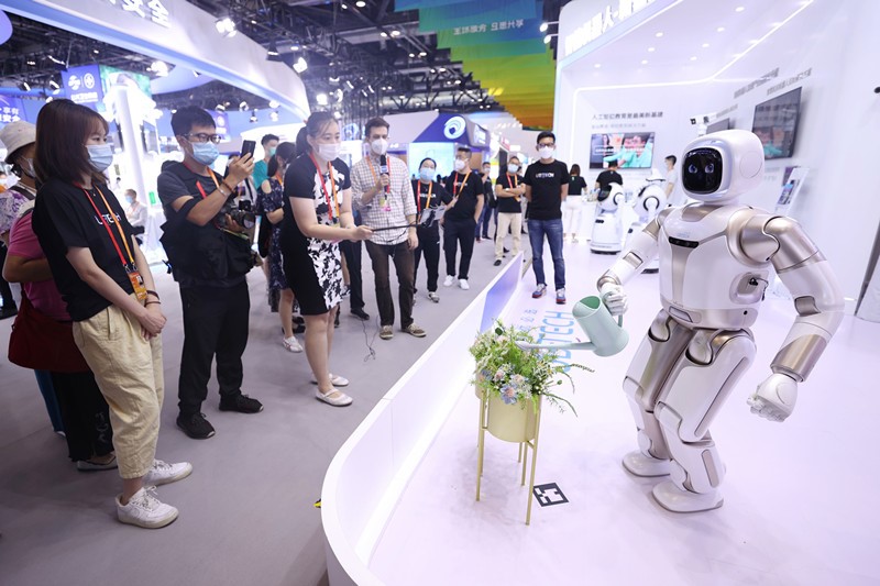Photo taken on September 6 shows visitors watching a robot water flowers in the comprehensive exhibition area of the 2020 China International Fair for Trade in Services (CIFTIS). (Photo by Chen Xiaogen/People's Daily Online)