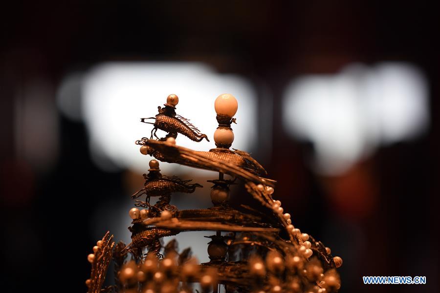 A crown is seen during an exhibition held in the Palace Museum in Beijing, capital of China, Sept. 10, 2020. An exhibition, entitled "Everlasting Splendor: Six Centuries at the Forbidden City", is held at the Palace Museum, also known as the Forbidden City, as the former imperial compound turns 600 this year. (Xinhua/Jin Liangkuai)