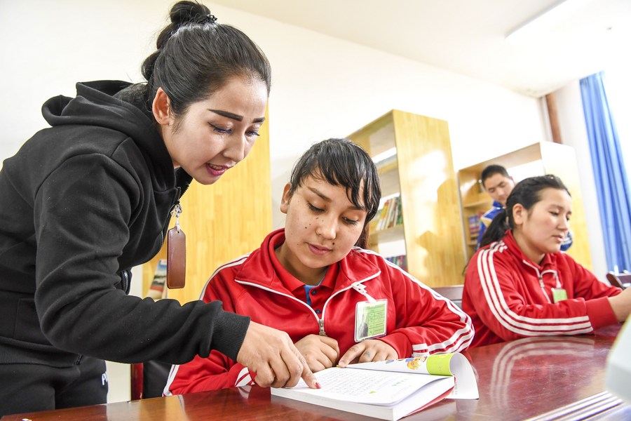 A teacher (1st L) instructs a trainee at a reading room of the vocational education and training center in Hotan county of Hotan Prefecture, northwest China's Xinjiang Uygur Autonomous Region, Oct. 7, 2018. (Xinhua/Hu Huhu)