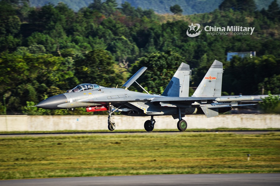 A fighter jet attached to an aviation brigade of the air force under the PLA Eastern Theater Command taxies down the runway after landing during a round-the-clock flight training exercise on September 17, 2020. Airmen with the aviation brigade fully studied the changes in weather, bird activity, equipment performance and other aspects brought about by seasonal changes, so as to practice the basic skills of aerial combat to the best. (eng.chinamil.com.cn/Photo by Fu Gan)