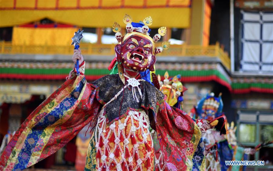 A masked Buddhist monk performs an annual Cham dance event to pray for good harvest and peaceful life at the Tashilhunpo Monastery in Xigaze, southwest China's Tibet Autonomous Region, Sept. 22, 2020. (Xinhua/Chogo)